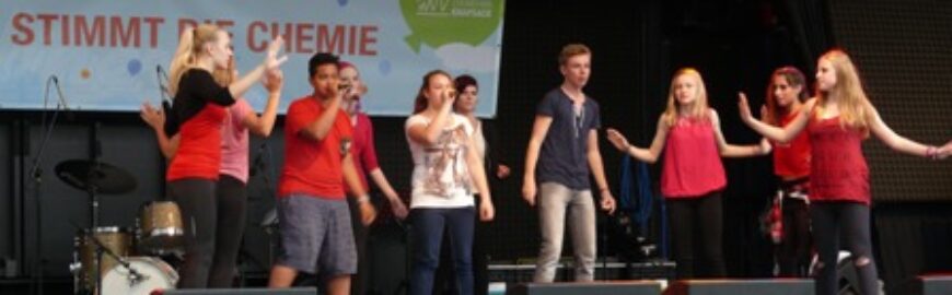 Im Rahmen des Tages der Chemie am 20.9.2014 hatte eine kleine Besetzung unseres Projekts „Kultur?Klasse!“ einen Auftritt im Chemiepark Knapsack. Einige der dort ansässigen Firmen sind Kooperationspartner unserer Schule und somit war es den Schülerinnen und Schülern sowie Projektkoordinator Herrn Schumacher ein Anliegen, auch e